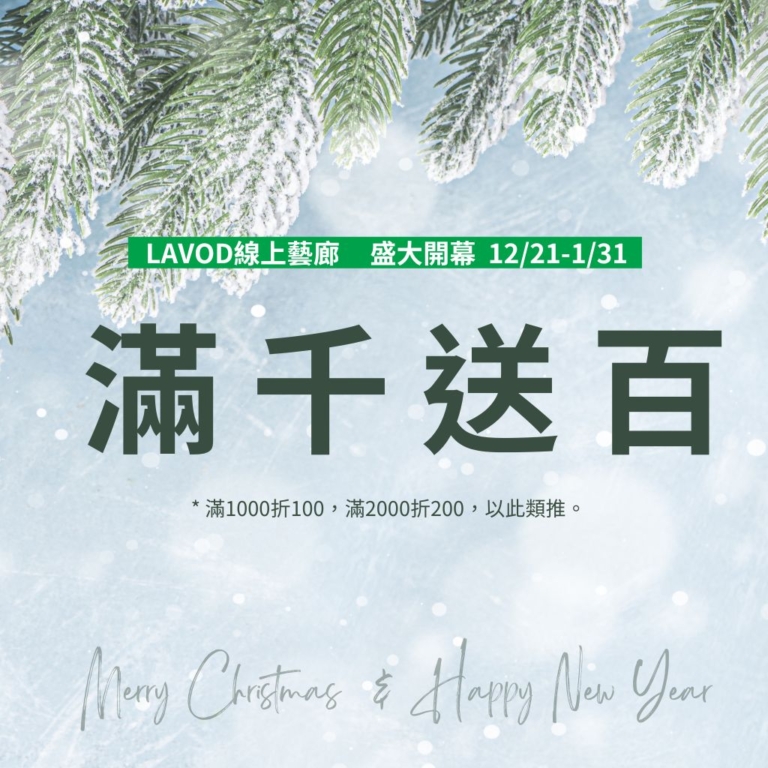 自12/21至1/31,凡購物滿千元即可享百元折扣,滿1000折100,滿2000折200 !! (以此類推) ,讓您的藝術之旅更添溫馨與喜悅。感謝您一直以來的支持與鼓勵,這是我們送給您的溫暖聖誕禮物與新年祝福!