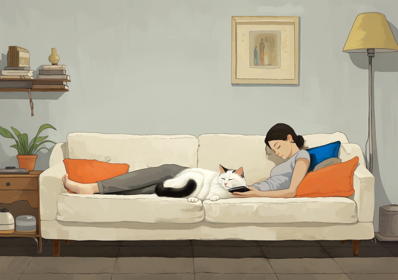 下班後放鬆的女人與貓之間的互動。