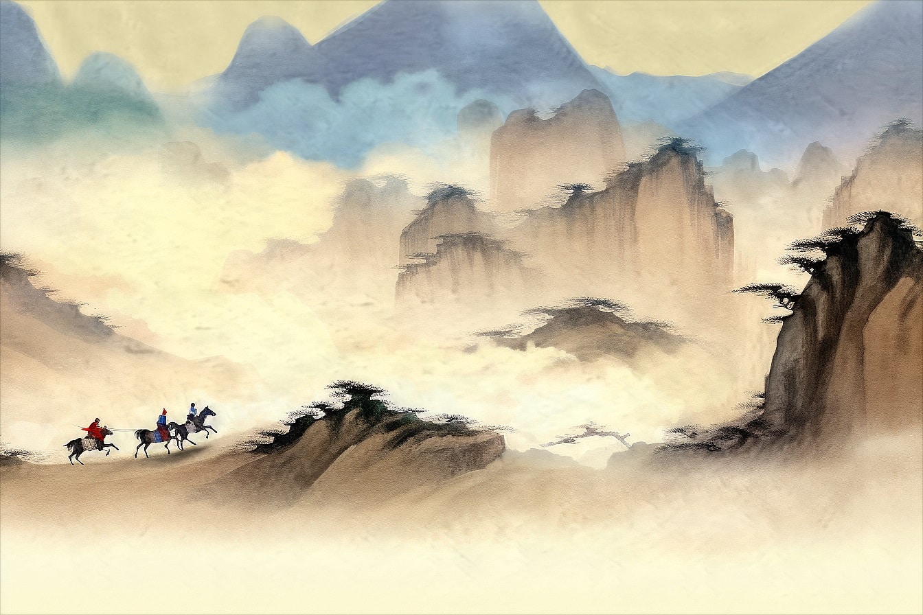 不同筆觸表達東方江湖的意境,人馬或緩行或急馳,不知有多少英雄兒女故事醞藏於中