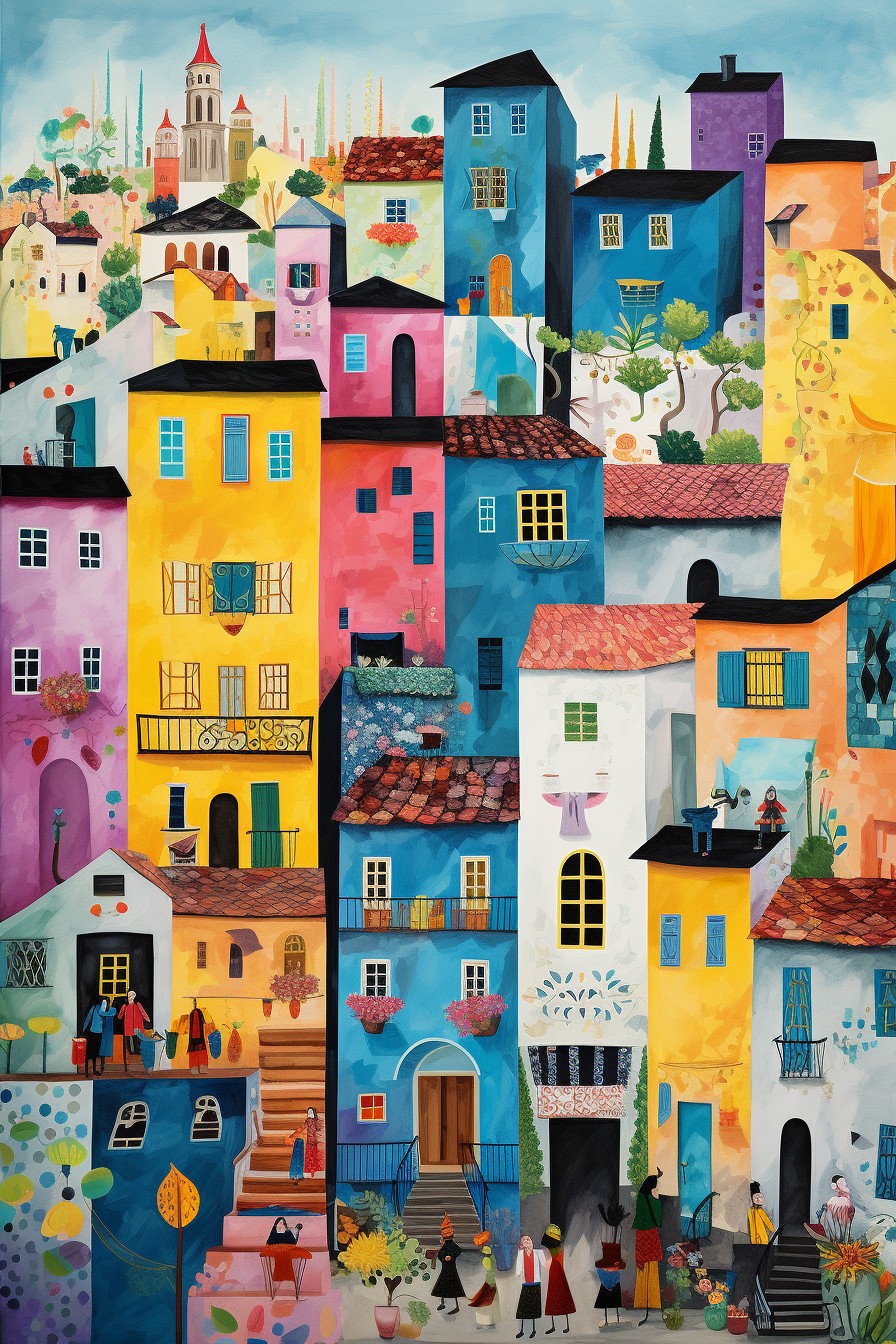 用活潑繽紛的色彩與手法表達村落風格與面貌,美好的童話世界