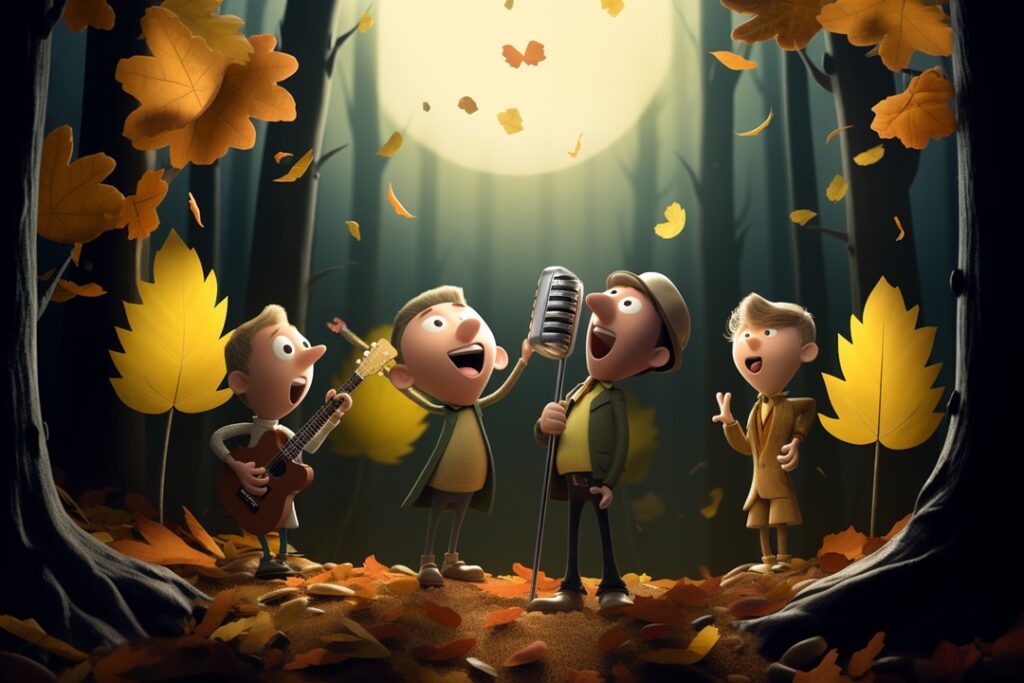 映照在月光下,在佈滿秋葉的森林裡,一群音樂家開始歡唱