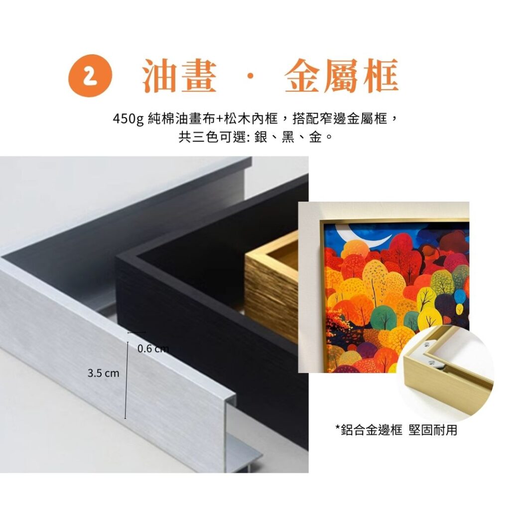 | 畫框款式 | 無框畫, 無框畫+金屬或實木外框 |